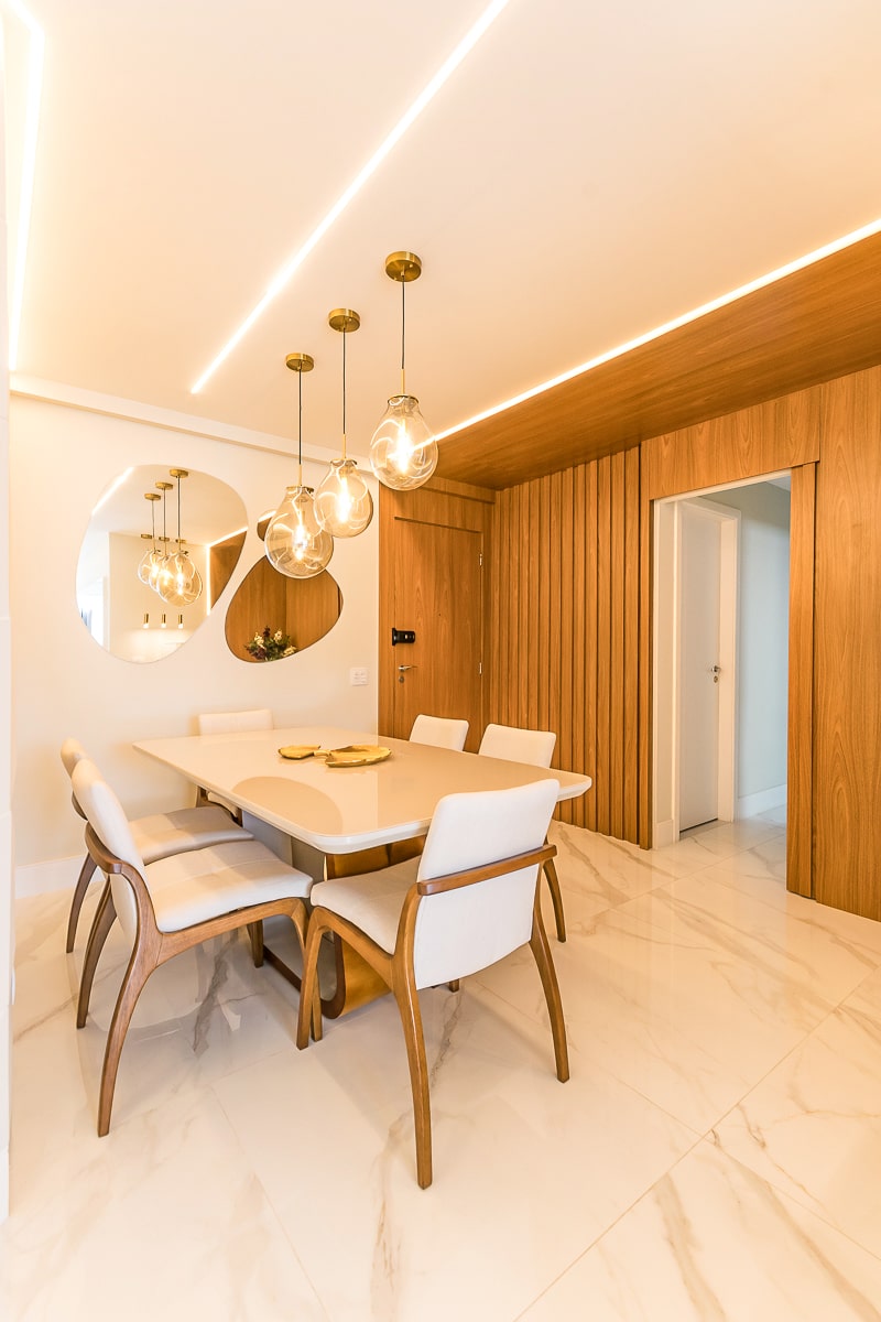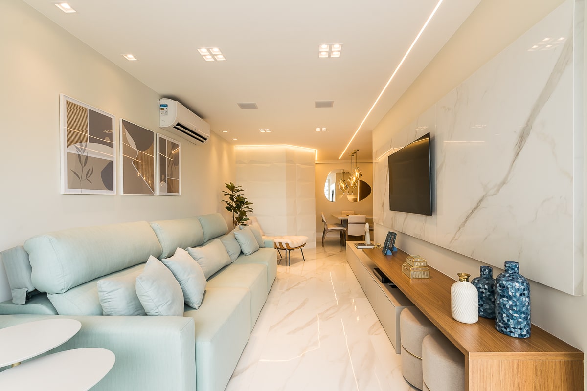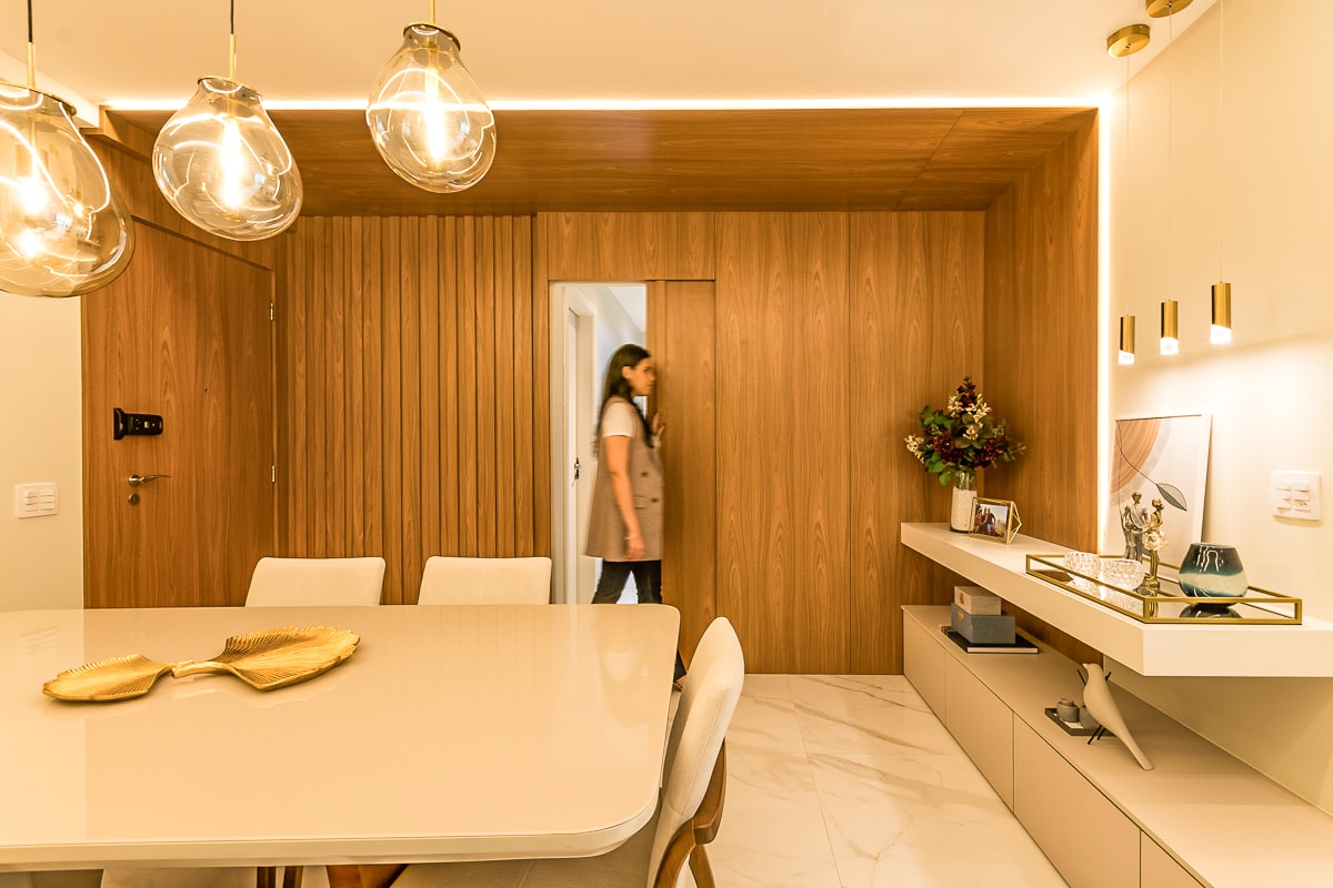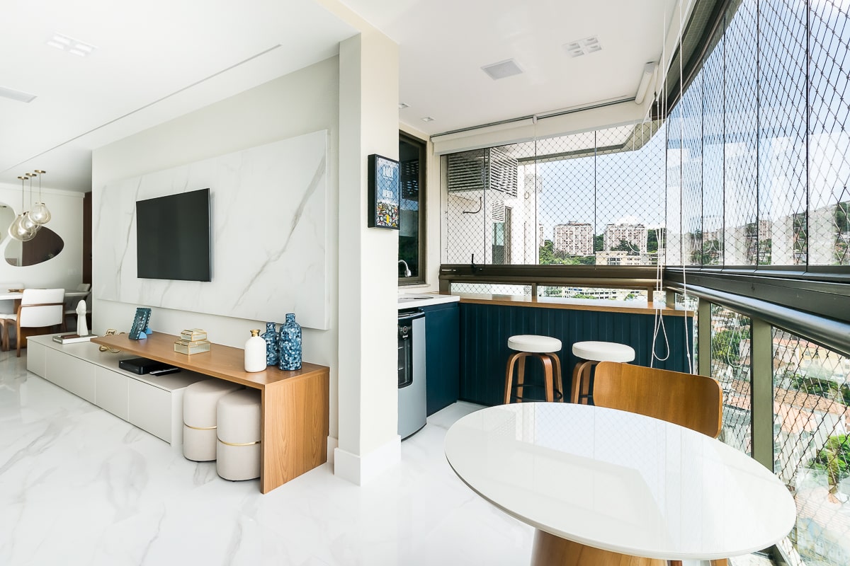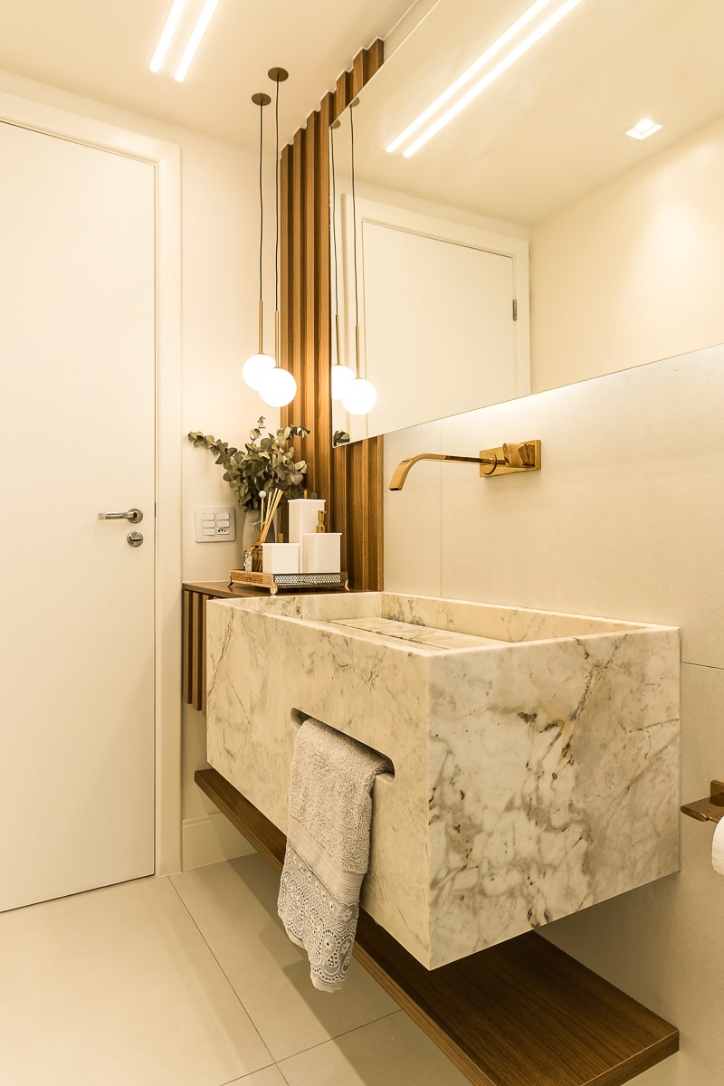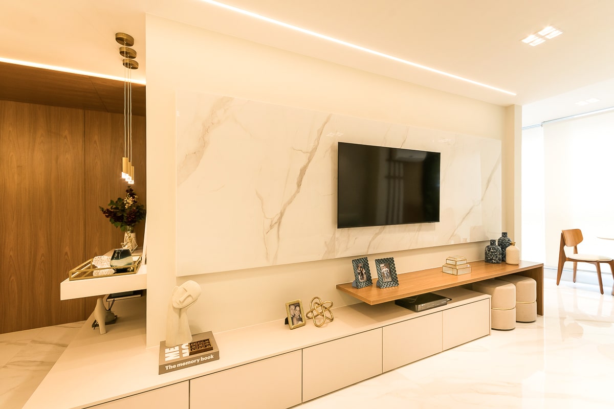 Era pré-requisito para este projeto manter a marcenaria existente nos quartos e integrar varanda e sala para receber, de maneira confortável, amigos e familiares. O resultado foi um apartamento contemporâneo, com toques clássicos, utilizando texturas que remetem a pedras e muitos detalhes em dourado.