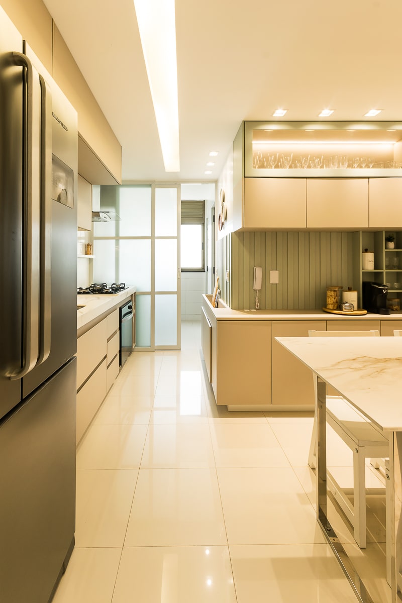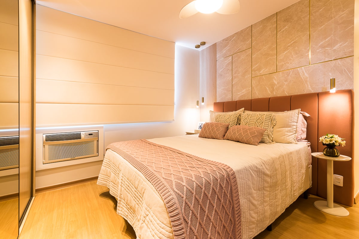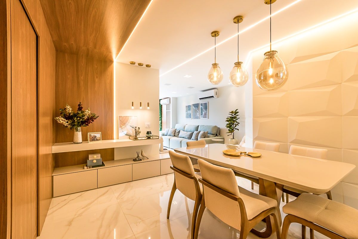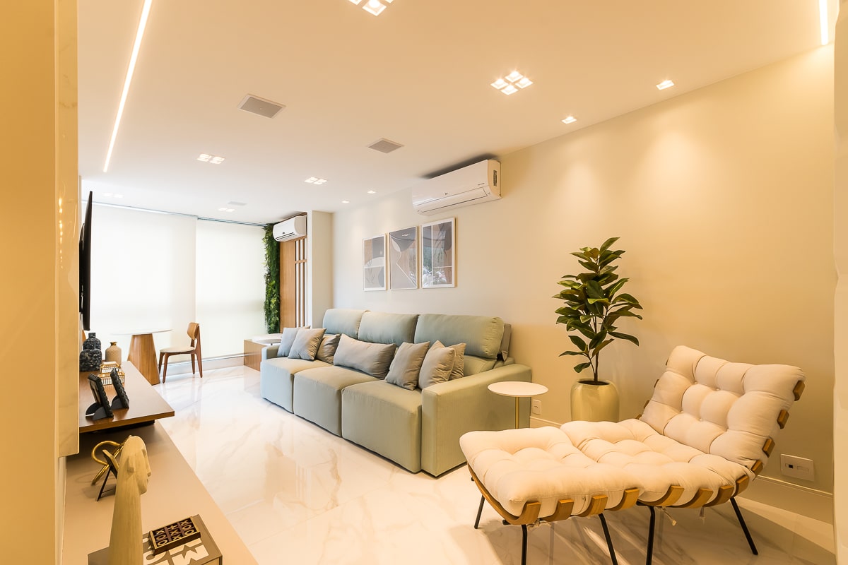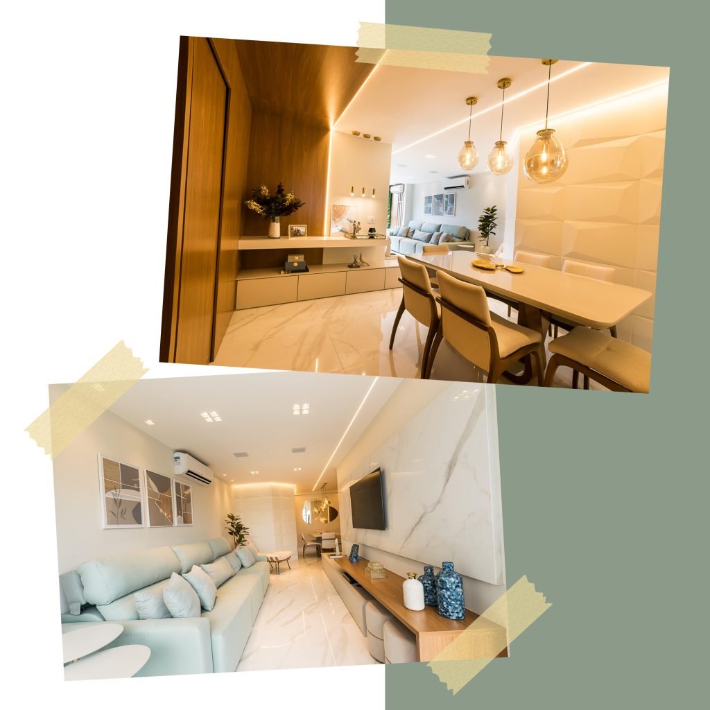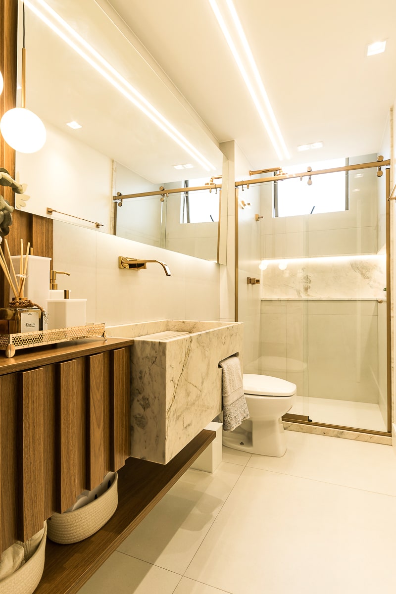 Era pré-requisito para este projeto manter a marcenaria existente nos quartos e integrar varanda e sala para receber, de maneira confortável, amigos e familiares. O resultado foi um apartamento contemporâneo, com toques clássicos, utilizando texturas que remetem a pedras e muitos detalhes em dourado.