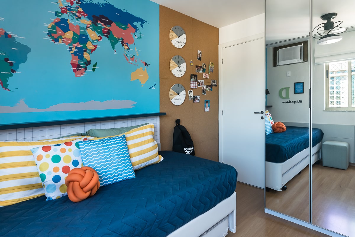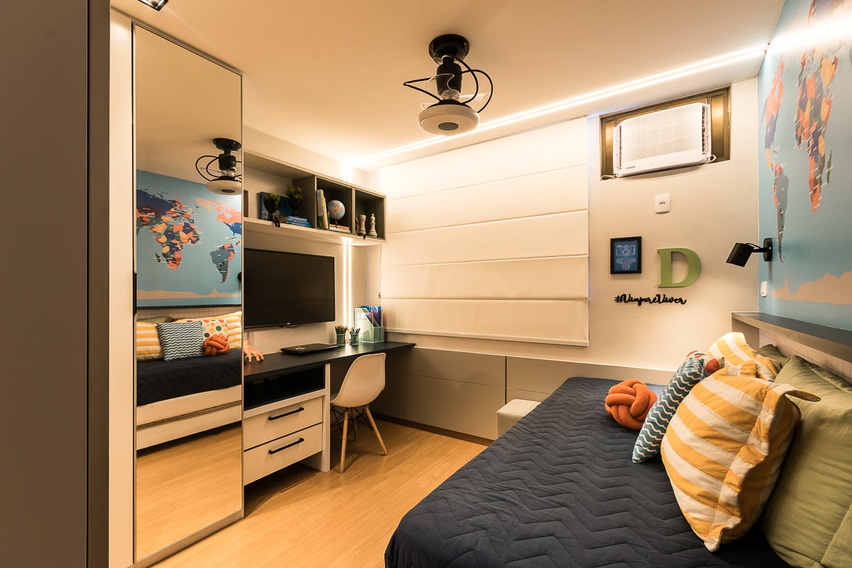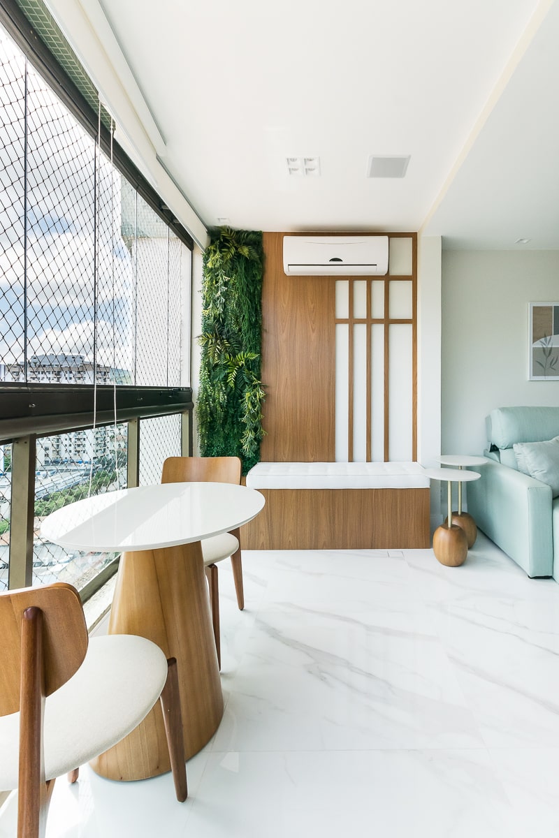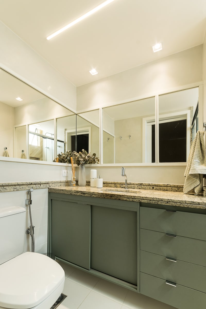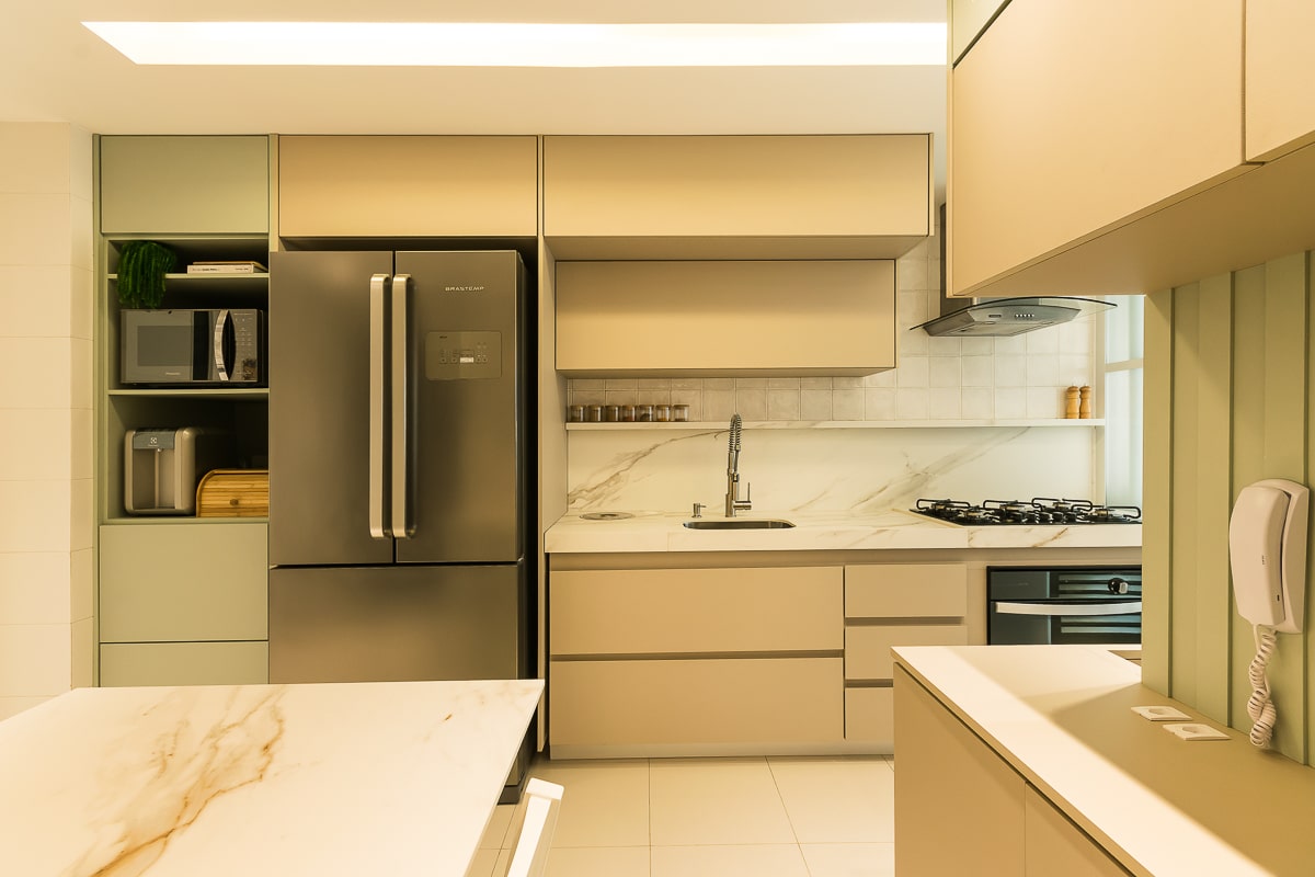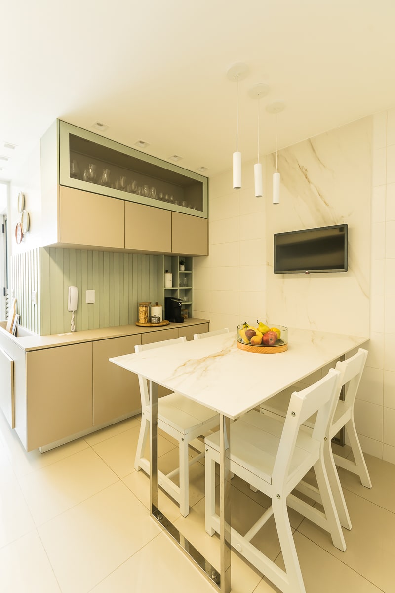 Era pré-requisito para este projeto manter a marcenaria existente nos quartos e integrar varanda e sala para receber, de maneira confortável, amigos e familiares. O resultado foi um apartamento contemporâneo, com toques clássicos, utilizando texturas que remetem a pedras e muitos detalhes em dourado.