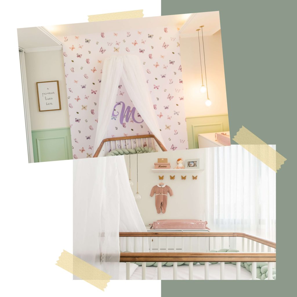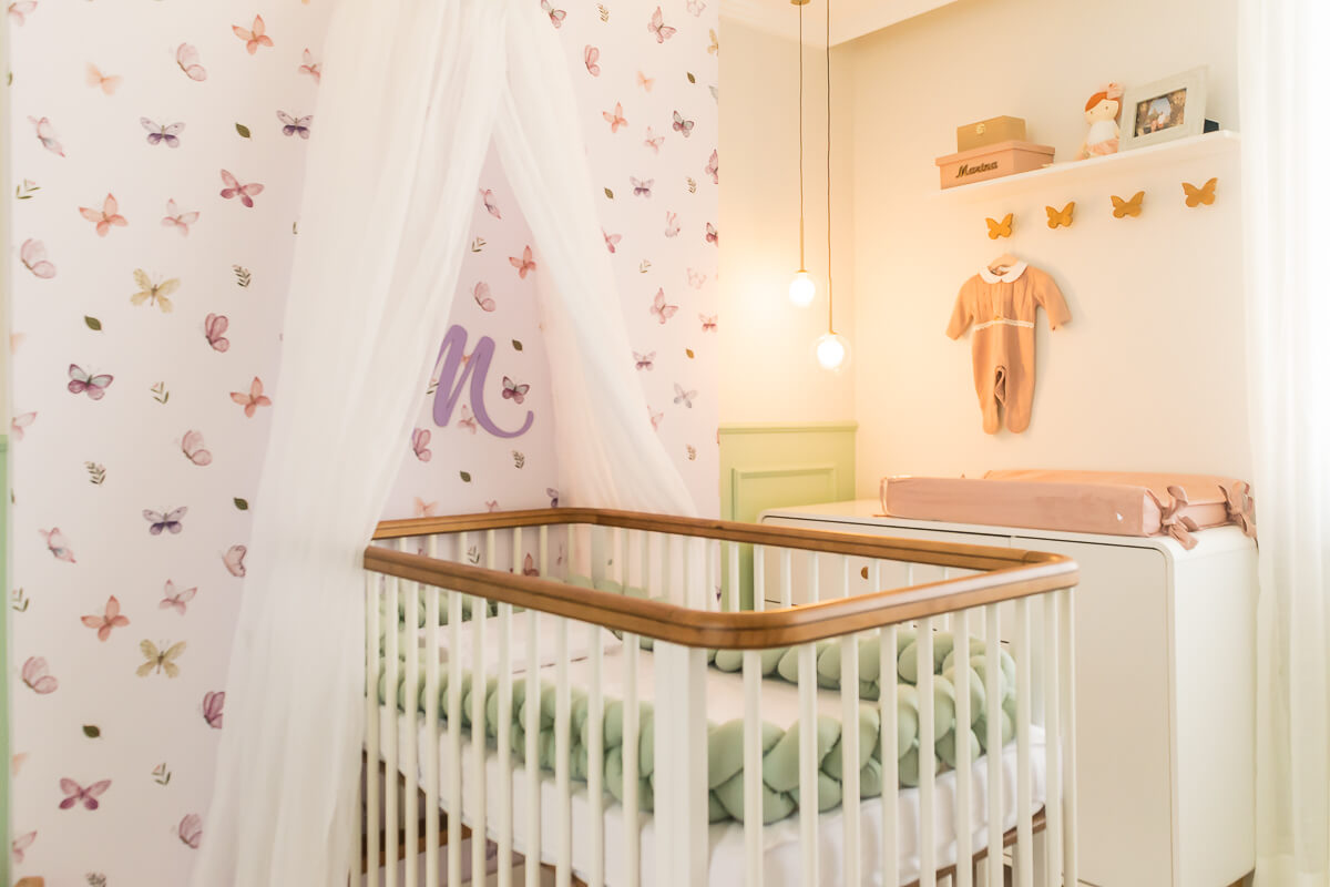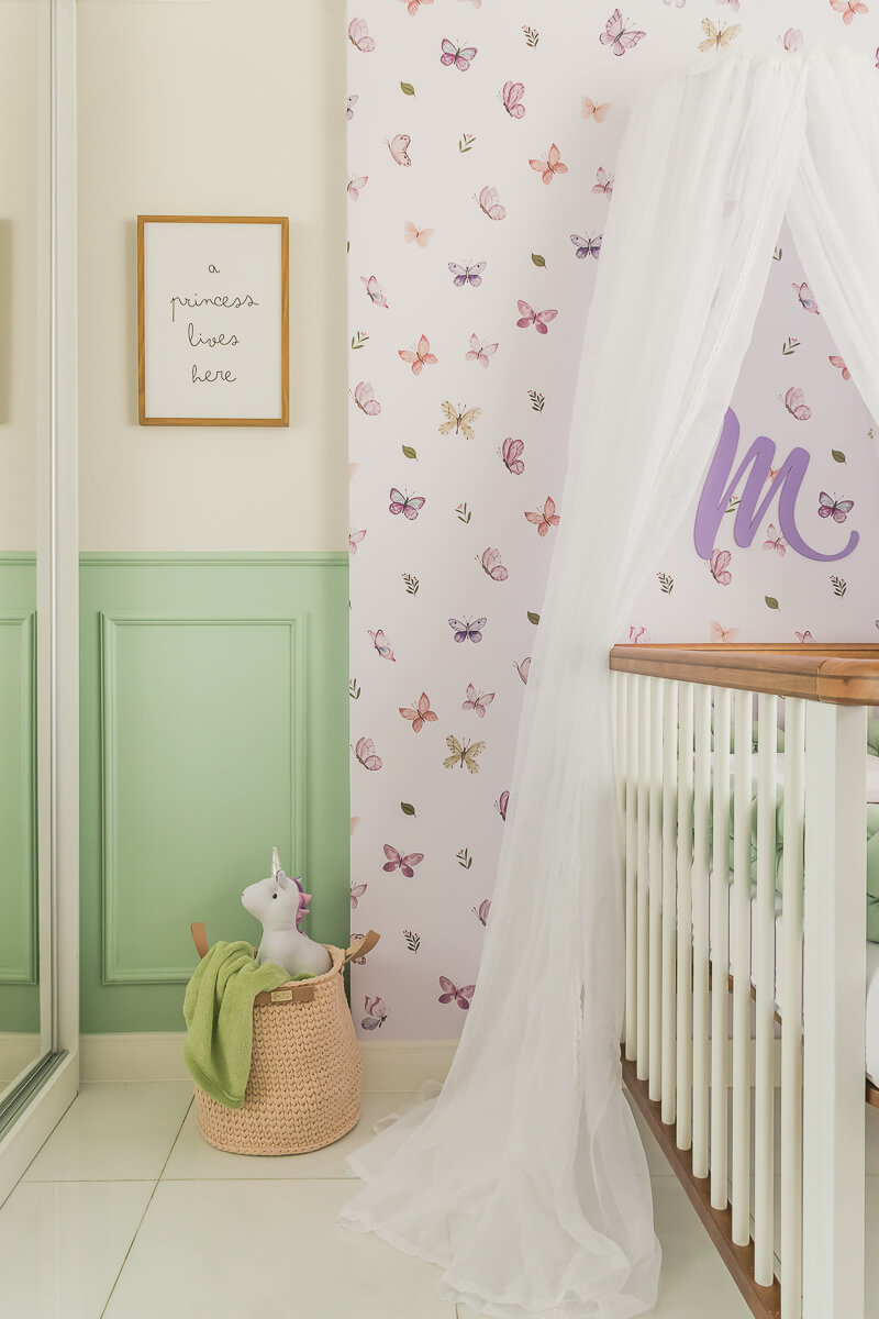 As borboletas tomaram conta do quarto da Marina. Utilizando apenas mobiliários soltos, papel de parede e uma pintura decorativa, transformamos o quarto de hóspedes/ escritório num lindo jardim de borboletas. A harmonia entre a paleta de cores, os detalhes em dourado, o tapete em crochê e o dossel para o berço, resultam em aconchego e elegância.