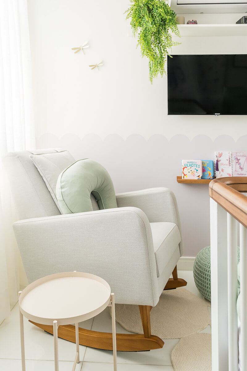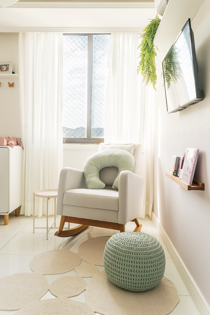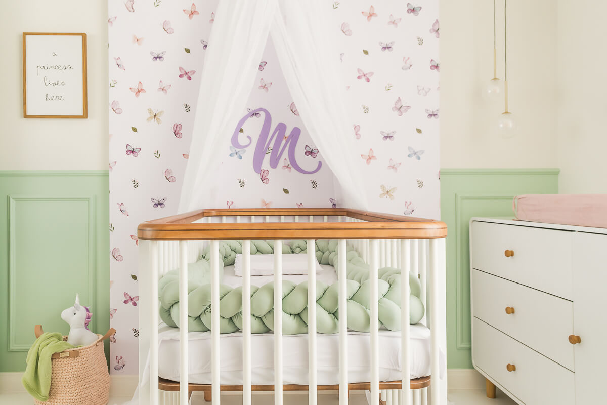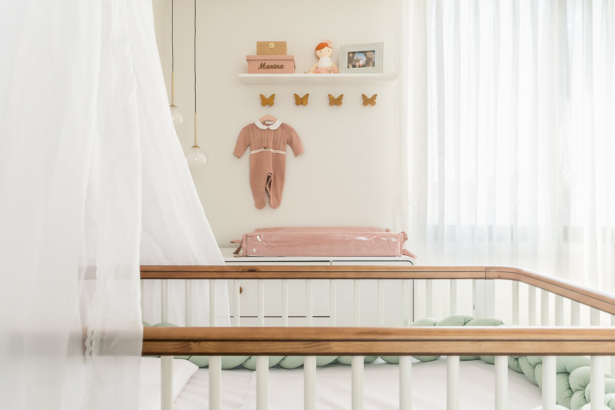 As borboletas tomaram conta do quarto da Marina. Utilizando apenas mobiliários soltos, papel de parede e uma pintura decorativa, transformamos o quarto de hóspedes/ escritório num lindo jardim de borboletas. A harmonia entre a paleta de cores, os detalhes em dourado, o tapete em crochê e o dossel para o berço, resultam em aconchego e elegância.