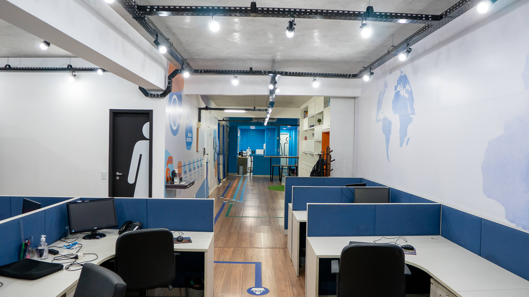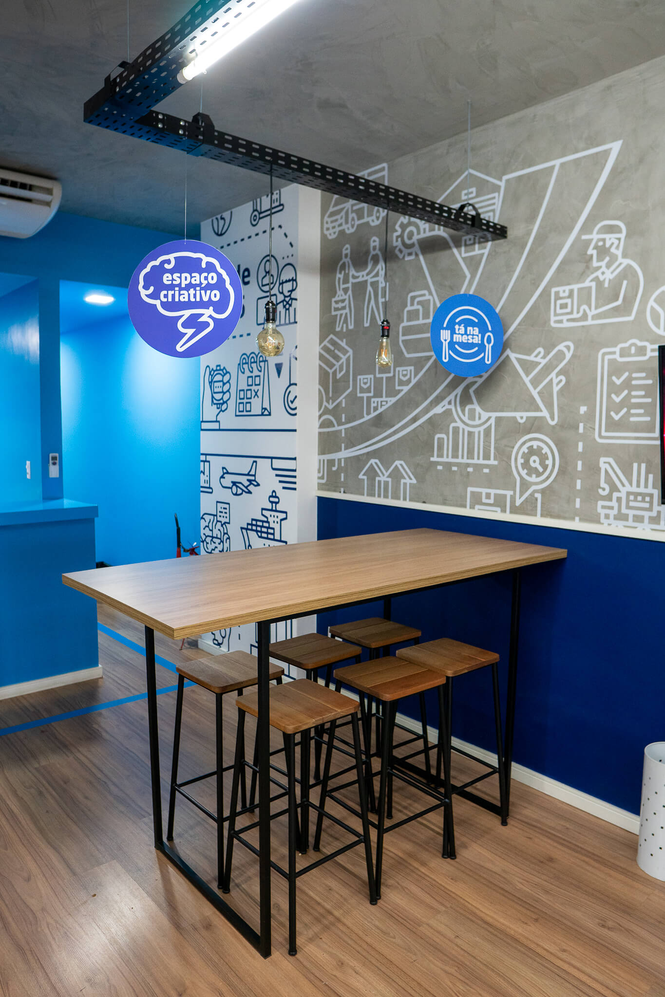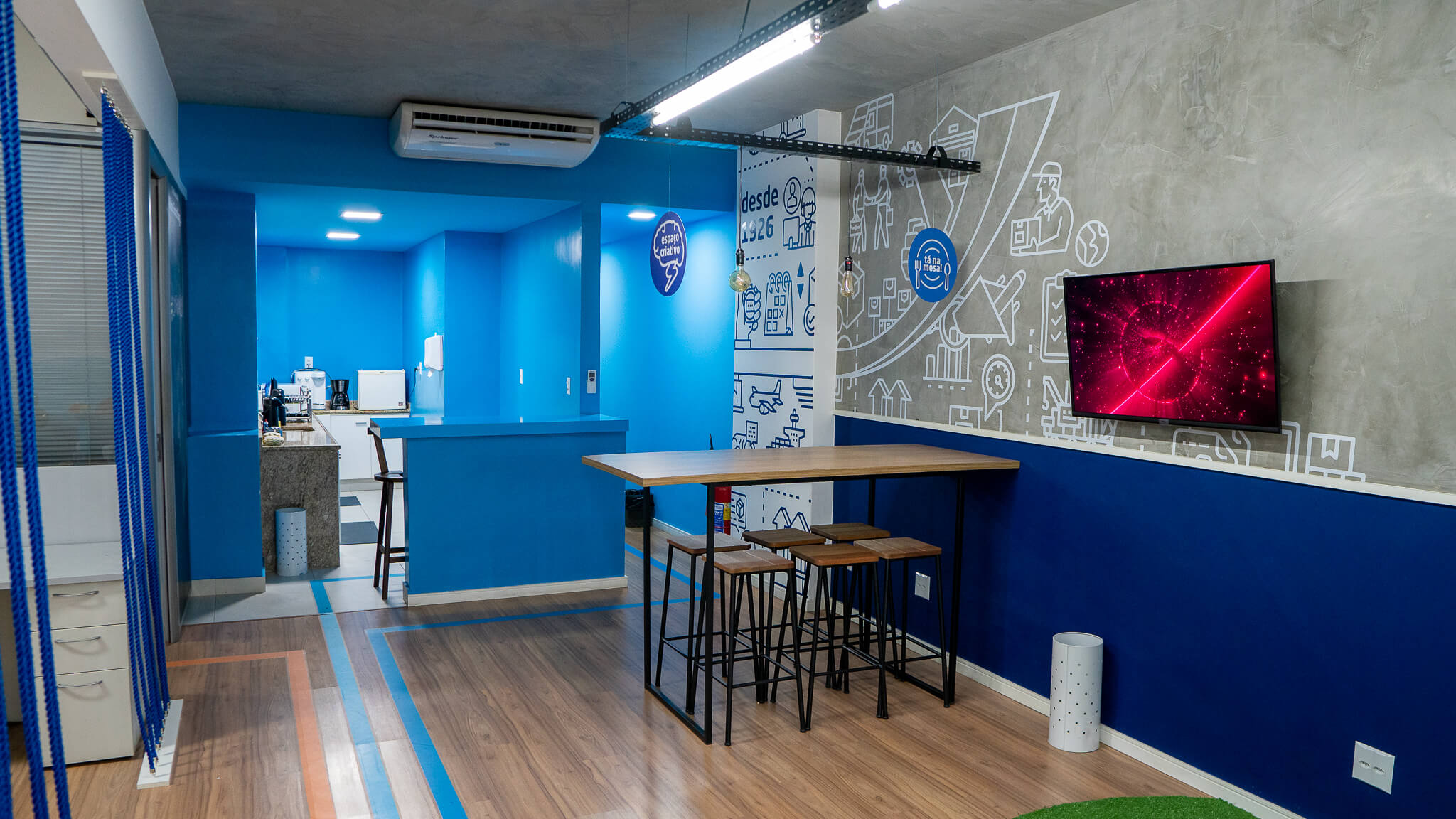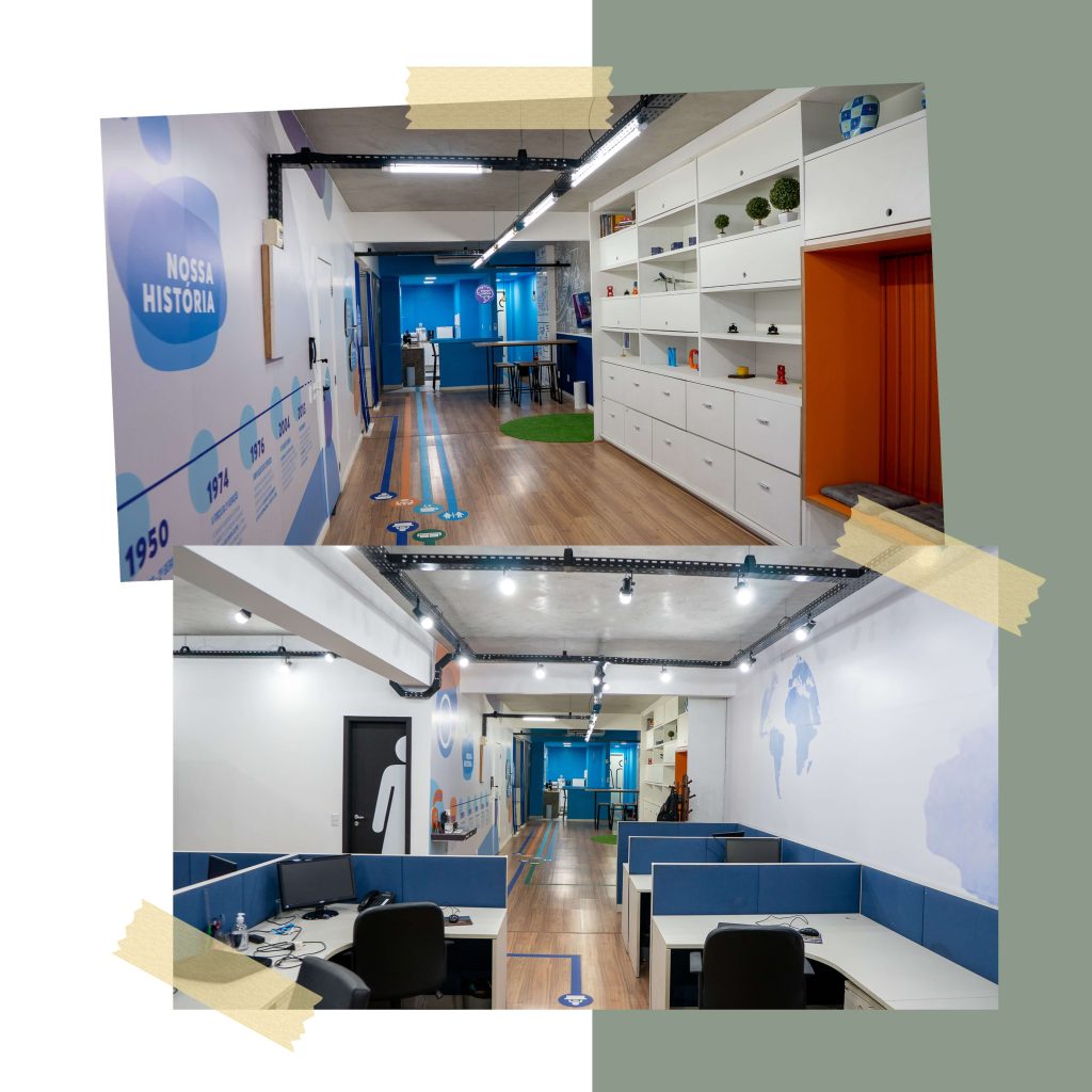 Para esse projeto, buscamos referências nas grandes empresas aduaneiras, coworkings e nas cores da empresa. O ambiente continuou integrando, porém setorizado através da pintura tipo caixa na cor azul, biombo de cordas na área de trabalho e adesivos em grande parte do escritório.
