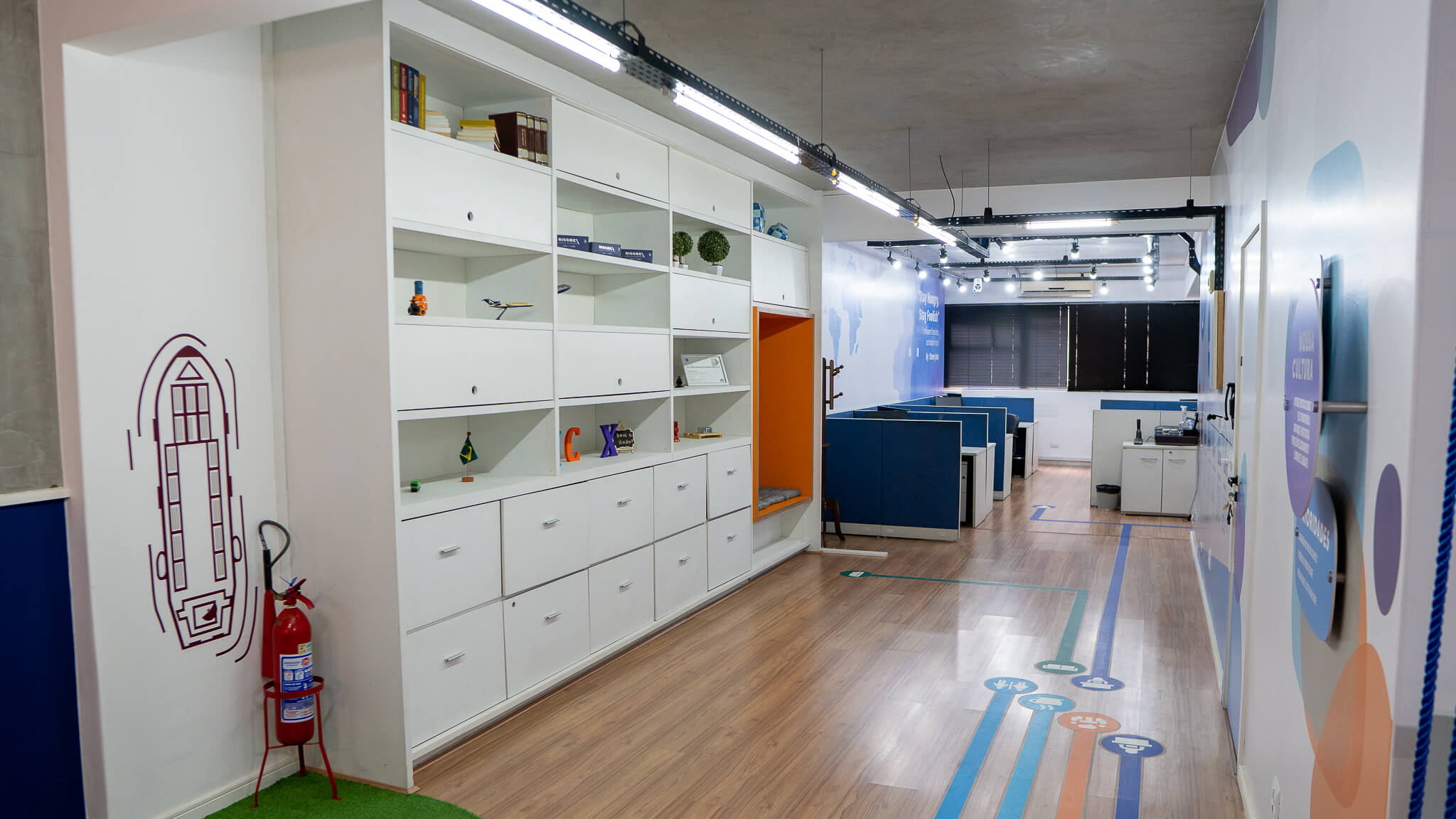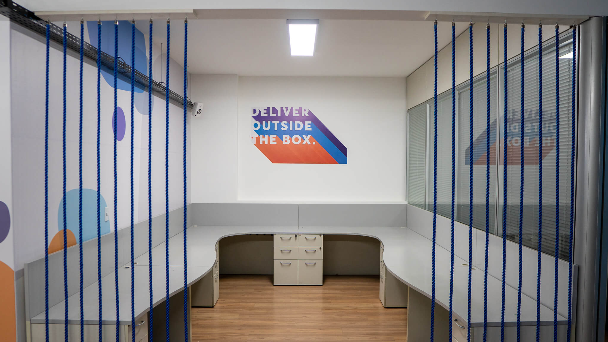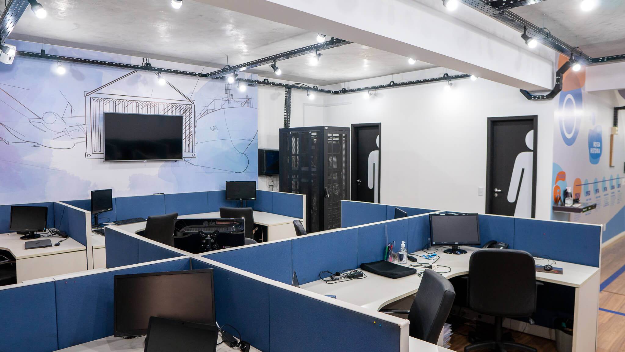 Para esse projeto, buscamos referências nas grandes empresas aduaneiras, coworkings e nas cores da empresa. O ambiente continuou integrando, porém setorizado através da pintura tipo caixa na cor azul, biombo de cordas na área de trabalho e adesivos em grande parte do escritório.