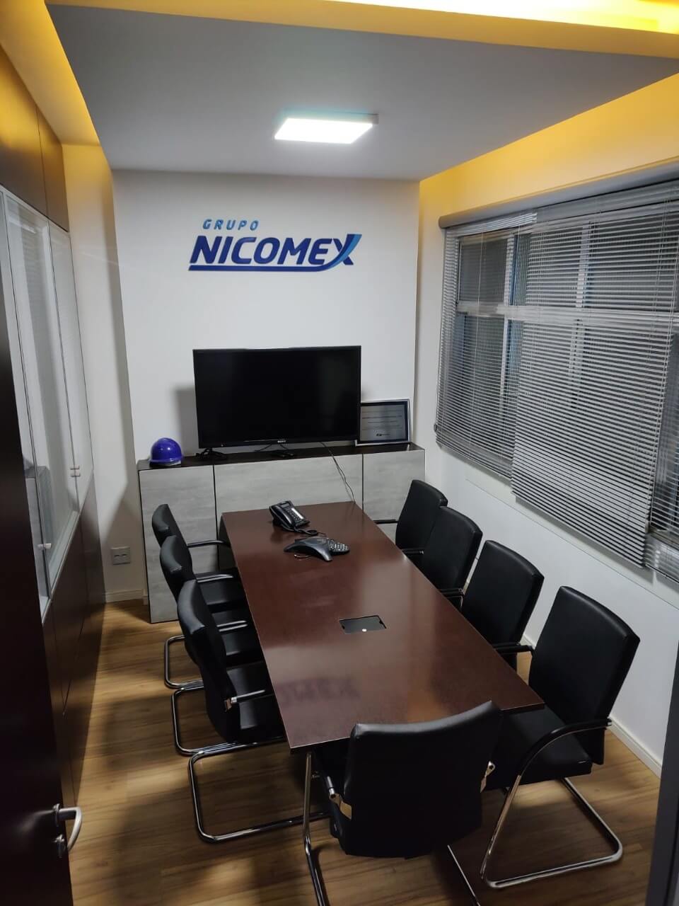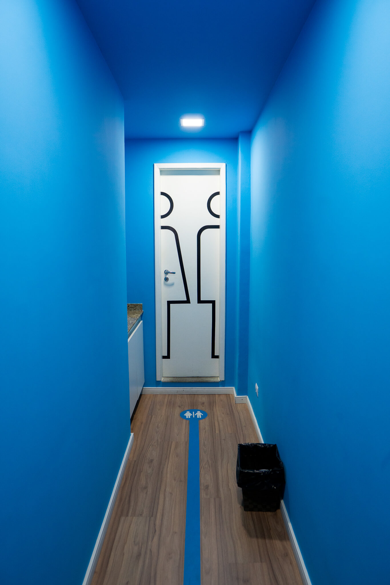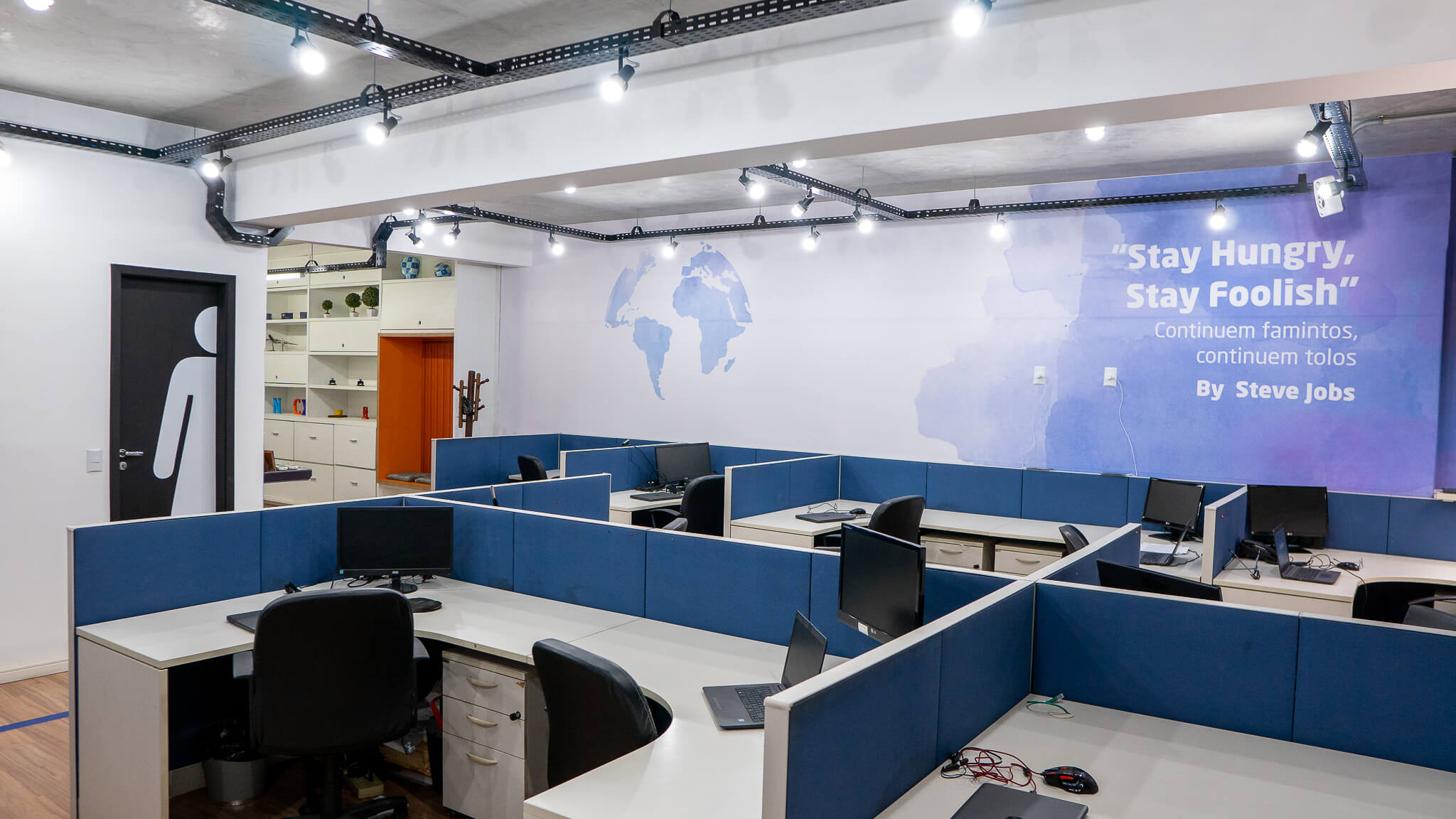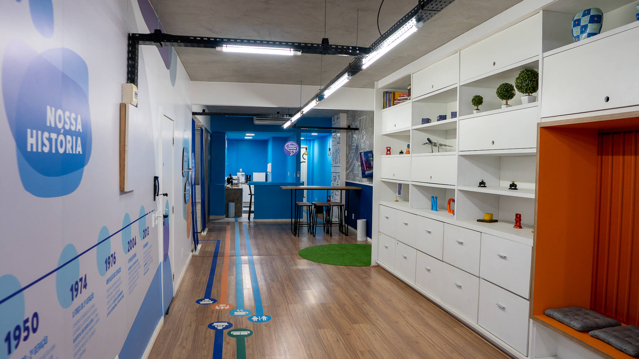 Para esse projeto, buscamos referências nas grandes empresas aduaneiras, coworkings e nas cores da empresa. O ambiente continuou integrando, porém setorizado através da pintura tipo caixa na cor azul, biombo de cordas na área de trabalho e adesivos em grande parte do escritório.