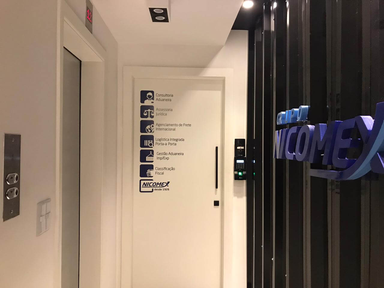 Assim como no interior da empresa, o hall de entrada também remete aos portos. E para isso, trouxemos a estética de um container para a parede principal, que leva a logo da empresa.